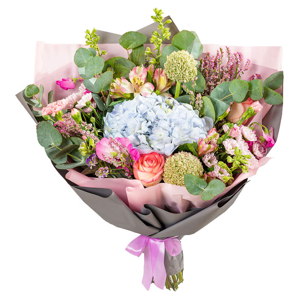 Гортензия, роза одноголовая, альстромерия, хризантема кустовая, эвкалипт, озотамнус.